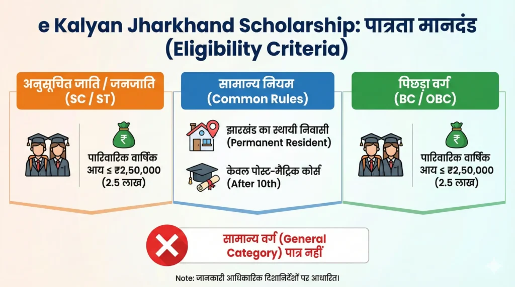 1. निवासी और श्रेणी (Residency & Category) सबसे पहली बात—आप झारखंड के पक्के निवासी (Local Resident) होने चाहिए। दूसरी बात, आप SC, ST या OBC (BC-I / BC-II) कैटेगरी से आने चाहिए।